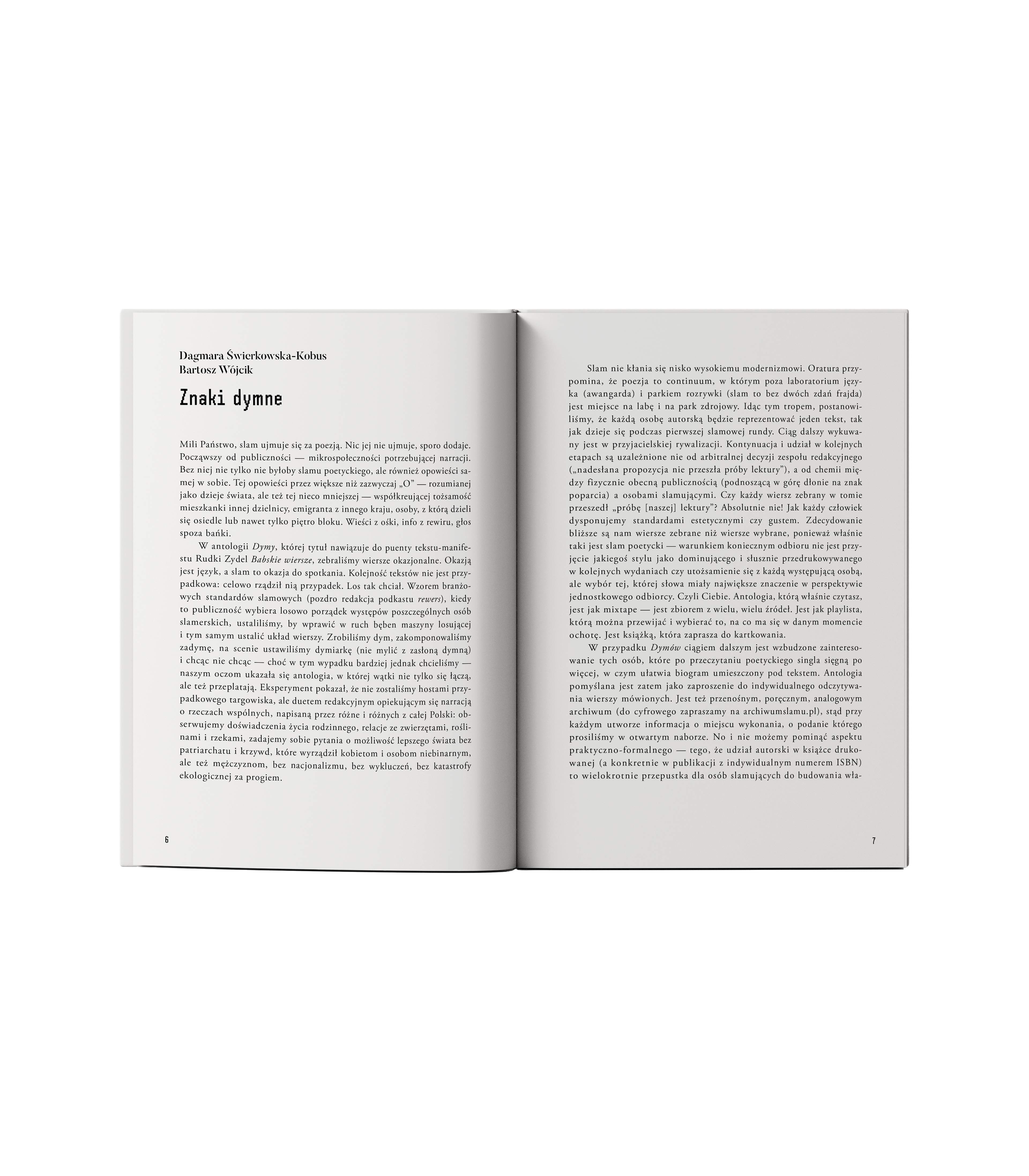 “Dymy” is the first printed anthology of slam poetry in Poland. The texts were selected through an open call and edited by Dagmara Świerkowska-Kobus and Bartosz Wójcik. The publication creates a platform for spoken-word literature and the artists who perform their work at poetry slams.