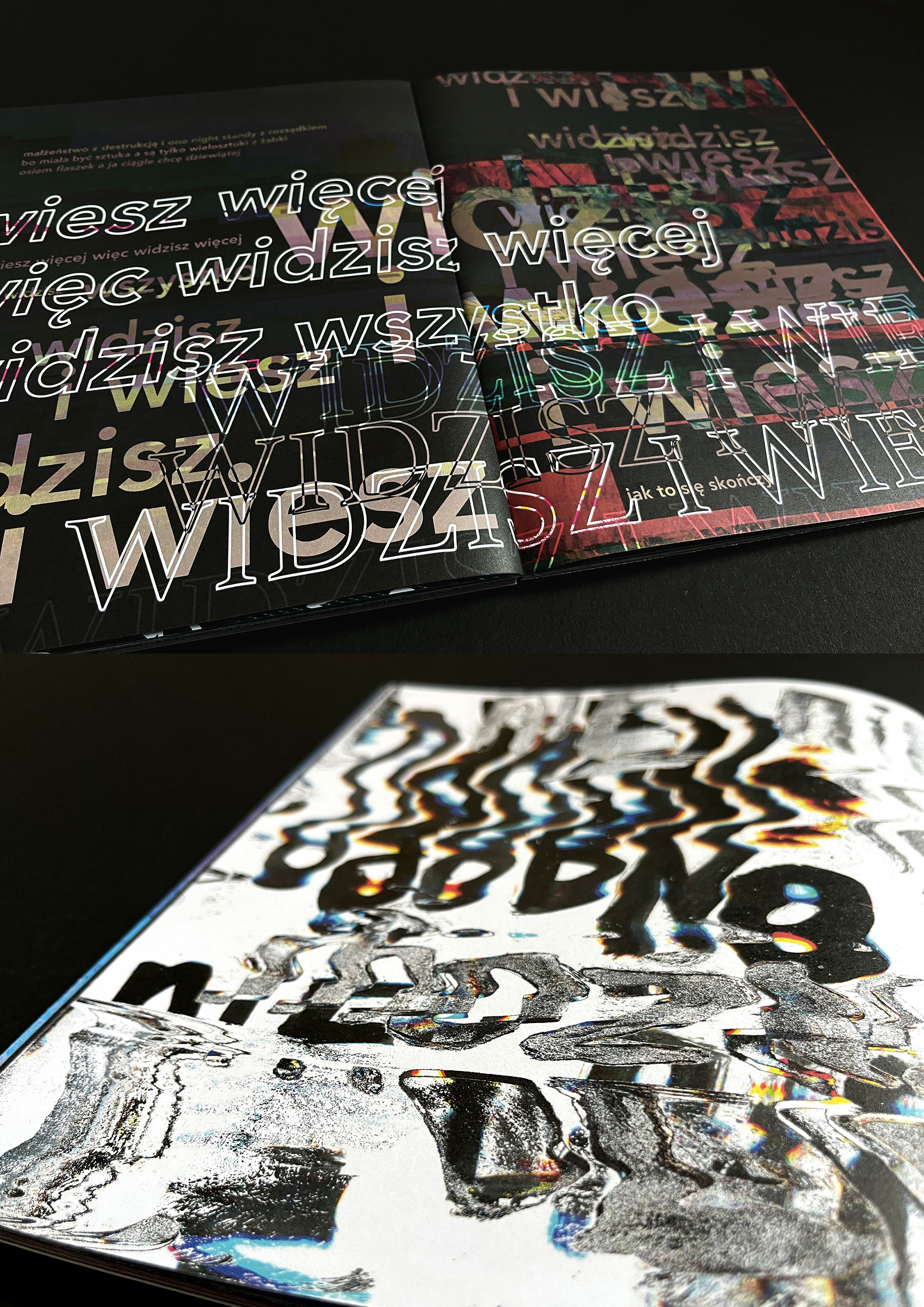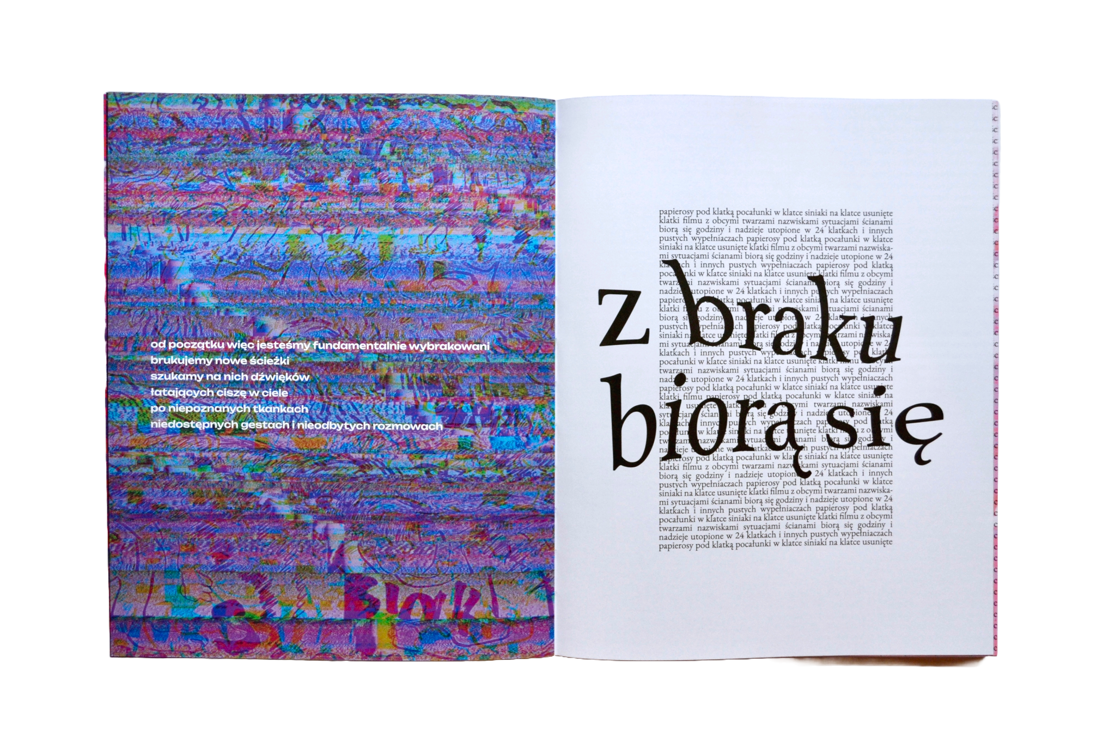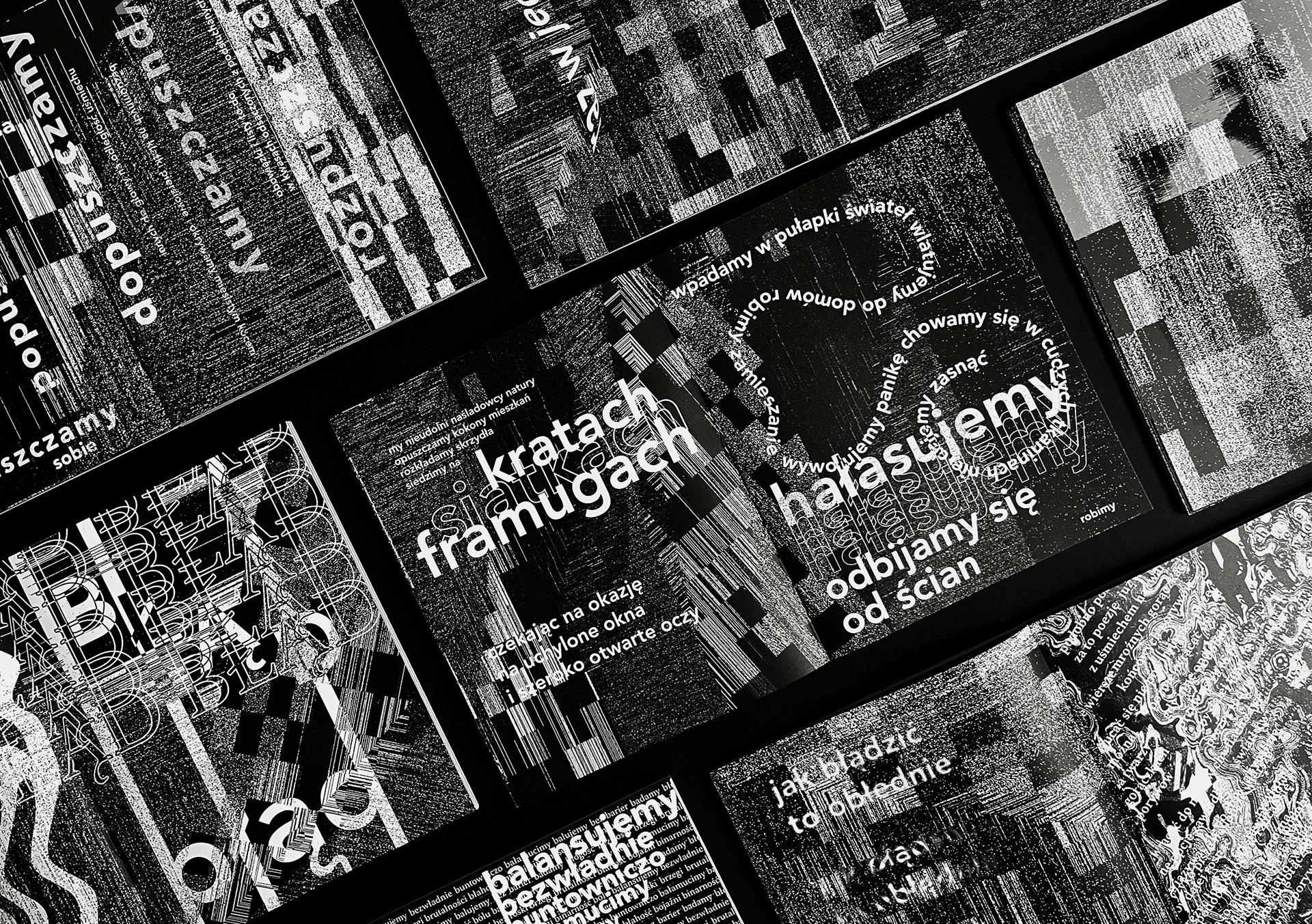 [ENG] “Obłędność” [loosely translated to "Madness"] is a publication that gathers texts performed by the author at poetry slams in 2021–2022. It presents them in a reworked form, using experimental typography combined with glitch-art-inspired illustrations. The book attempts to convey the energy and ephemerality of slam texts—written for stage performance—in a graphic format. The size and placement of letters reflect the pace and tone of the spoken words. Legibility makes room for impression, and content of poems becomes a pretext for new compositions. The publication’s eclecticism reflects the author’s aesthetic interests and offers poetry in a new, visually engaging perspective for the reader.